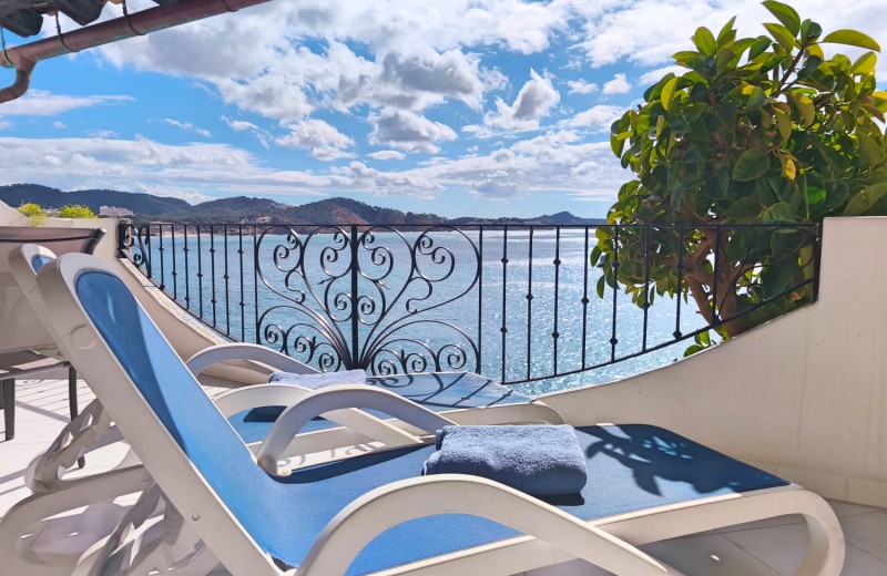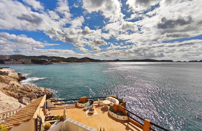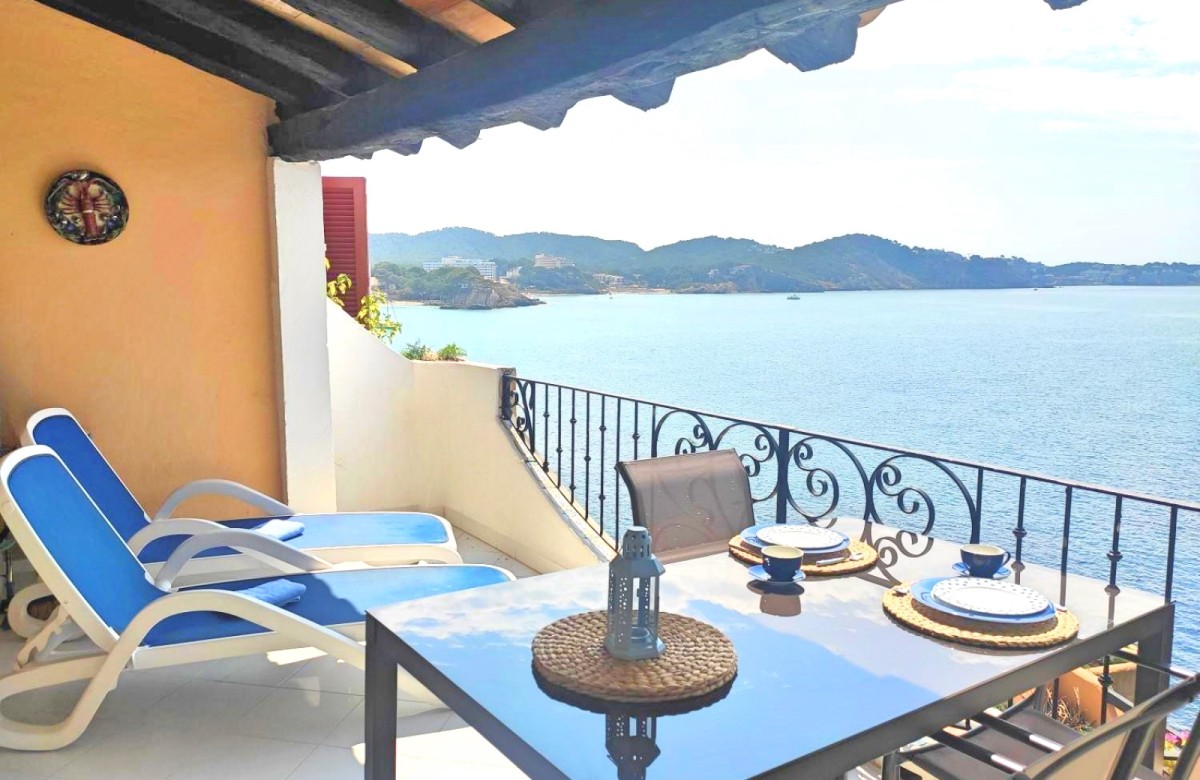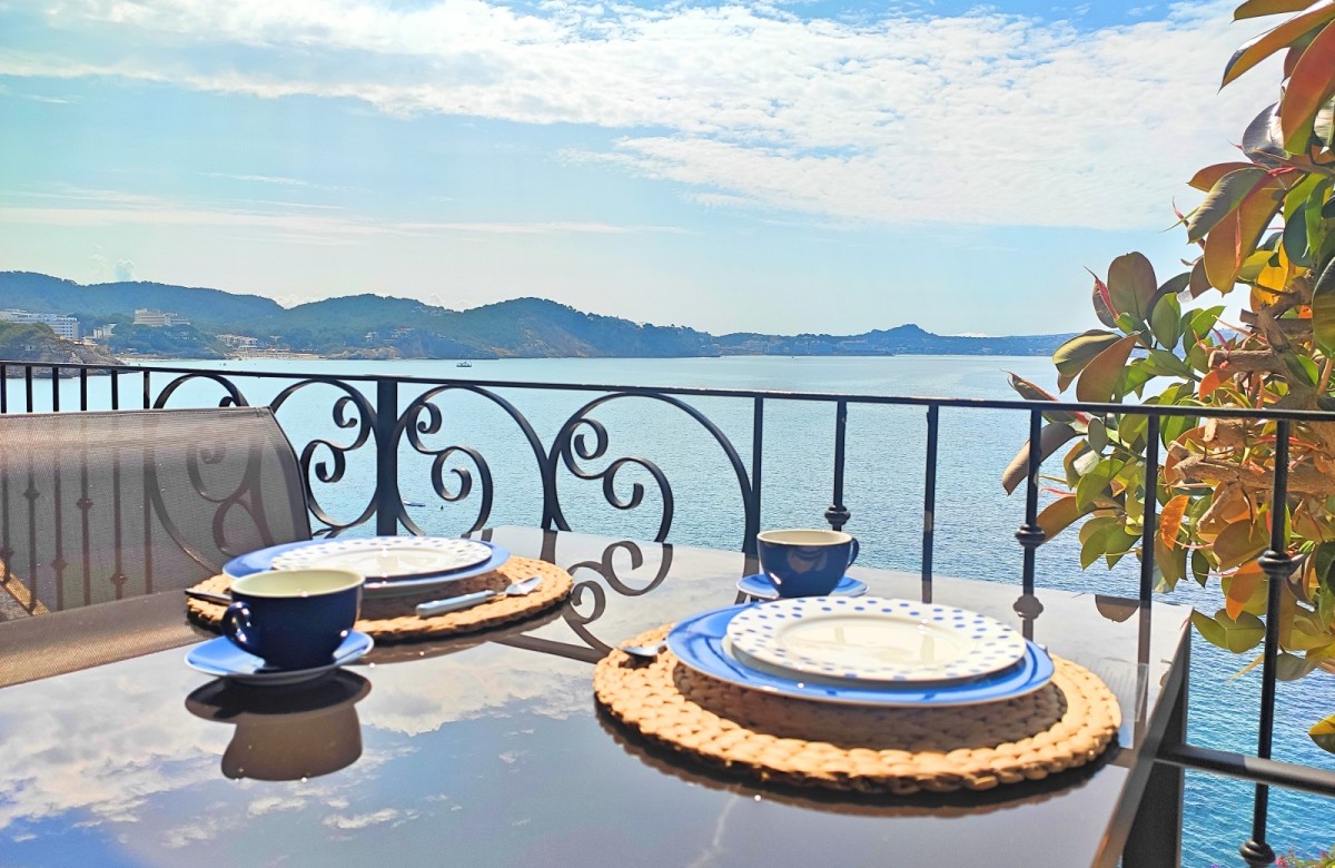 Genießen Sie unvergessliche Urlaubstage in dieser charmanten mit mallorquinischen Elementen eingerichteten Ferienwohnung in einer beliebten Anlage in Cala Fornells. In zweiter Meereslinie gelegen, bietet das Apartment aus nahezu jedem Raum einen traumhaften Ausblick auf das Meer. Der offene Wohn-Essbereich mit angrenzender Küche führt direkt auf die ca. 20 m² große, halb überdachte Terrasse – der perfekte Platz, um den in den Tag zu starten oder den Abend ausklingen und den Blick auf das Meer schweifen zu lassen.