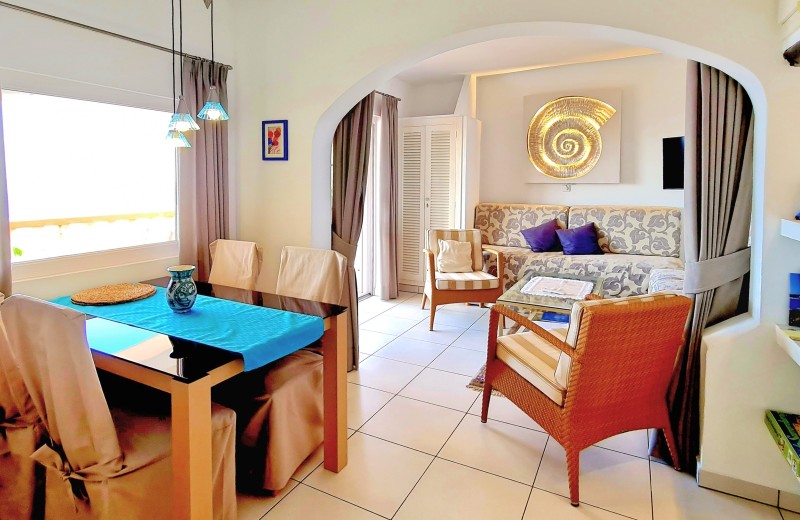 Die Wohnung überzeugt mit einem offenen Wohn-/Essbereich im modern-mediterranen Stil und einer voll ausgestatteten, offenen Küche. Durch bodentiefe Schiebetüren gelangen Sie auf die ca. 22 m² große, teilüberdachte Terrasse – Ihr idealer Platz für entspannte Stunden mit Meerblick. Auch das Schlafzimmer mit Doppelbett bietet einen traumhaften Blick über die Dächer hinweg zum Meer.