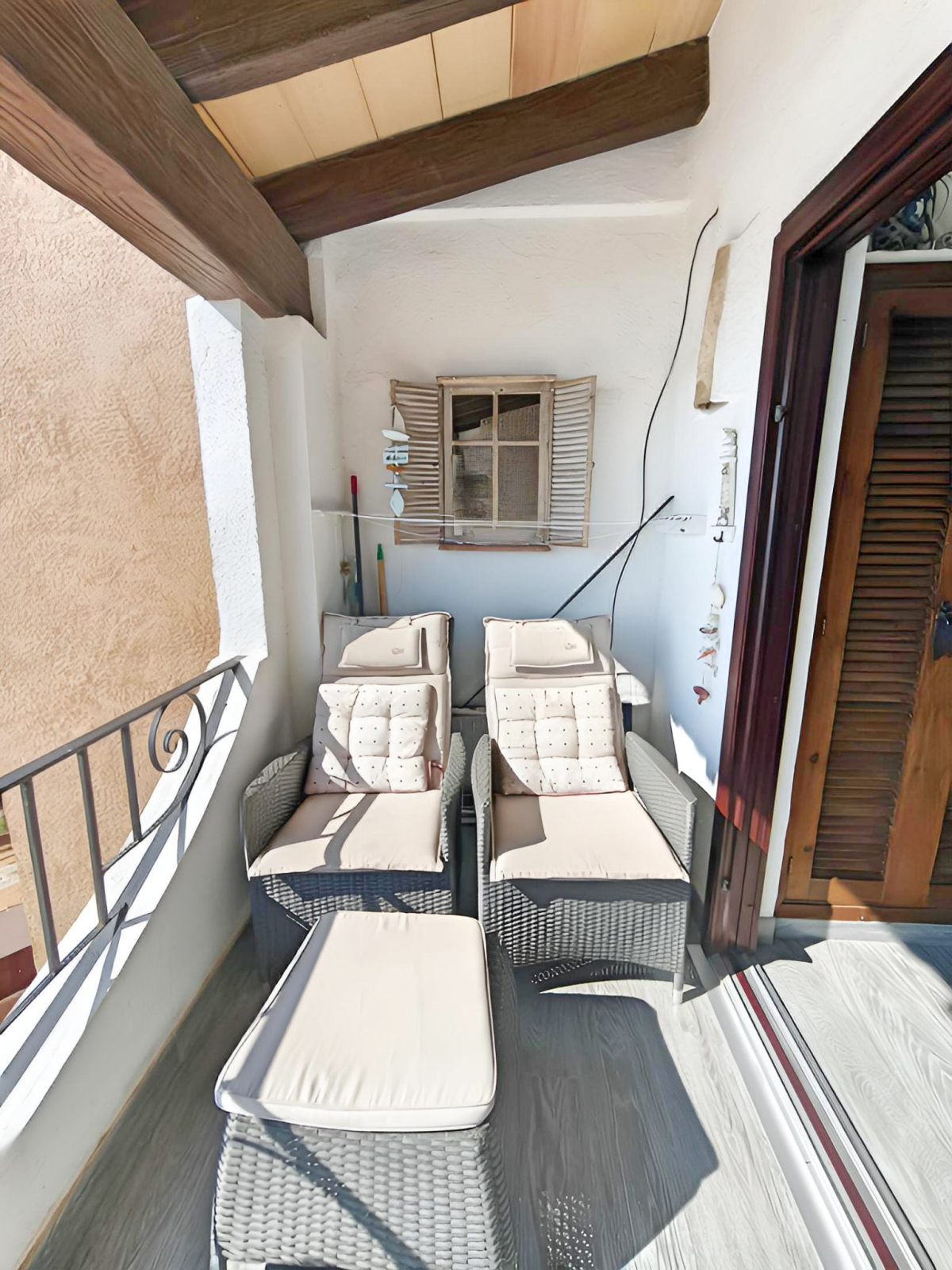 Die überdachte Terrasse, direkt vom Wohnbereich über eine große Schiebetür erreichbar, lädt mit ihrem Esstisch zum Verweilen ein – ob beim morgendlichen Kaffee oder einem romantischen Abendessen mit unvergleichlicher Kulisse. Nur wenige Schritte entfernt lockt der Gemeinschaftspool mit angrenzendem Restaurant und einem weiteren traumhaften Meerblick. Weitere Steinterrassen mit direktem Meerzugang bieten ideale Orte zur Entspannung. Eine Klimaanlage sorgt ganzjährig für ein angenehmes Raumklima.
