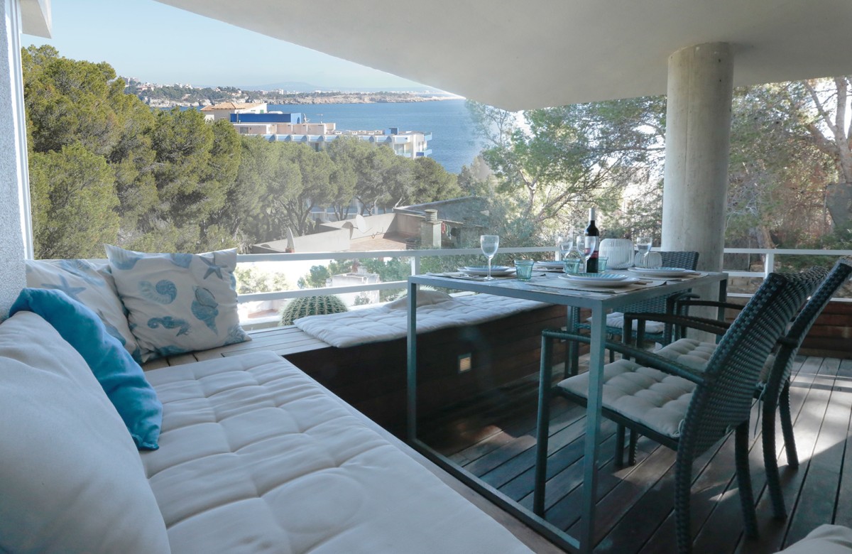 Diese modern eingerichtete Ferienwohnung liegt nur etwa 400 Meter vom Strand von Illetas entfernt. Von der ca. 12 m² großen, überdachten Terrasse genießen Sie einen herrlichen Blick auf das Meer, der über die Dächer der umliegenden Häuser hinweggeht. Die Terrasse lädt mit großzügigen Holzbänken und einem Esstisch zum Entspannen und Verweilen ein. Darüber hinaus steht Ihnen der Gemeinschaftspool der Anlage zur Verfügung (im Winter geschlossen).