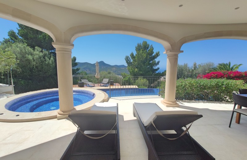 Die Grenze zwischen Innen und Außen löst sich nahtlos auf: Elektrisch vollständig zu öffnende Fensterfronten verbinden die Wohnbereiche mit dem beeindruckenden Außenbereich: einer großen Terrasse mit davor befindlichem 12 Meter langer Infinity-Pool und ein beheizbarer Außen-Whirlpool mit Wasserfall sowie den darunter befindlichem mediterranen Garten. Weitere Terrassen an den Schlafzimmern sowie eine große Dachterrasse mit Rundumblick runden das Gesamtbild dieses Luxisvilla ab. Hier heisst es, ankommen, relaxen und einfach nur die Seele baumeln lassen.