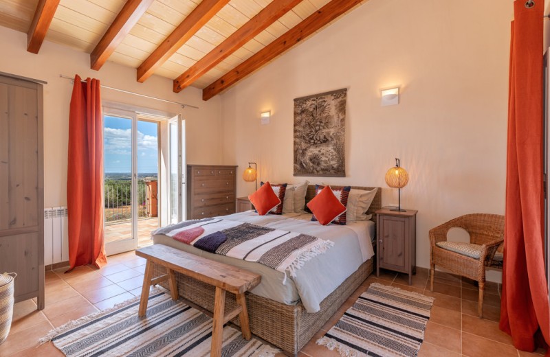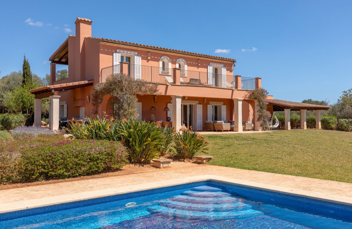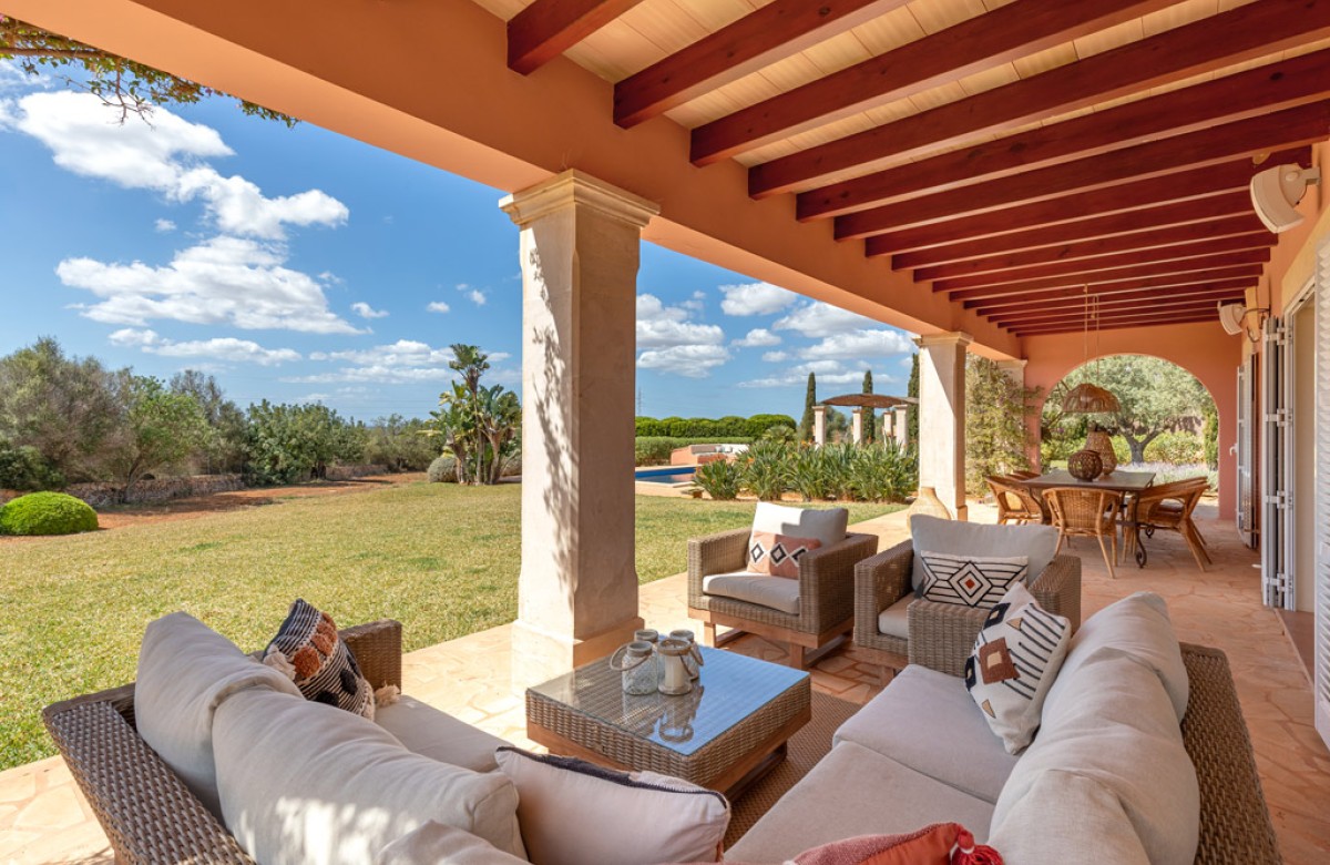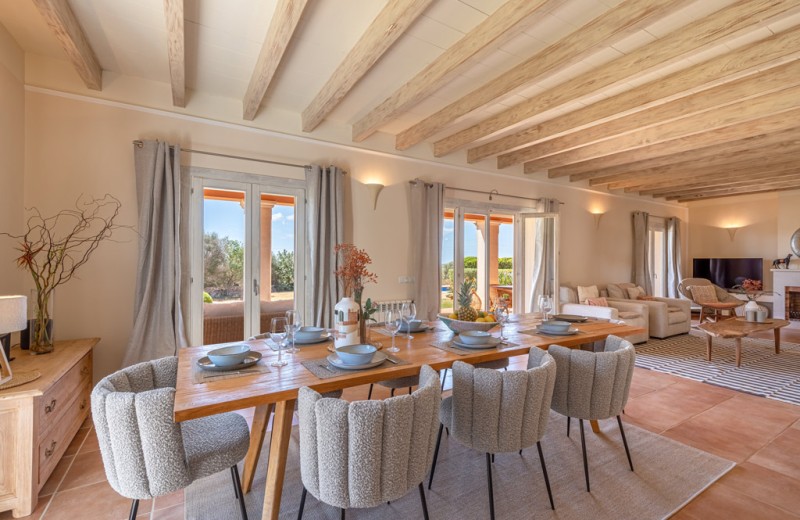 Die Finca selbst ist sehr geschmackvoll und modern eingerichtet. Sie betreten das Haus durch die großen Holztüren und vom großen Flur geht es weiter in das weitläufige Wohn-Eßzimmer oder über die Treppe in das obere Stockwerk, in dem sich die Schlafzimmer befinden. Vom Wohn-Essbereich gelangt man man über bodentiefe Flügeltüren auf die davor befindliche überdachte Terrasse mit Eßbereich, die einen wunderbaren Blick auf den Garten bietet. Eine Loungearea lädt zum Entspannen und relaxed ein. Ebenfalls im Erdgeschoß befindet sich die große und moderne Küche, von der man auch einen Zugang zur Terrasse hat. Eine Aussenküche sowie ein mobiler Grill sorgen für schöne Abende auf der Terrasse. Ein Gäste-WC ist ebenfalls vorhanden.