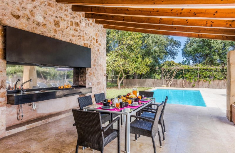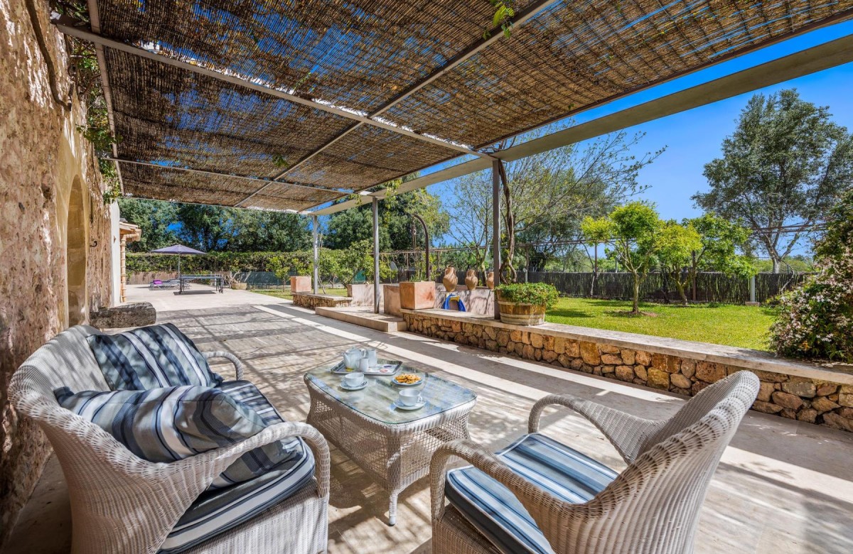 Das Anwesen selbst besticht durch seine gelungene Symbiose aus Tradition und Moderne. Der historische Kern der Finca wurde mit größter Sorgfalt restauriert, während ein zeitgenössischer Anbau stilvoll und respektvoll die ursprüngliche Bauweise aufgreift. Betreten Sie das Anwesen über die vordere Terrasse und werden Sie von einem großzügigen Wohn- und Essbereich mit hohen Holzbalkendecken empfangen. Hier laden bodentiefe Fensterfronten das Licht Mallorcas ein und schaffen eine nahtlose Verbindung zwischen Innen und Außen. Vom gemütlichen Wohnbereich mit seinen komfortablen Sitzgruppen führt Sie der Weg über seitliche Glasschiebetüren direkt auf die Seitenterrasse mit Esstisch und Grillmöglichkeit.