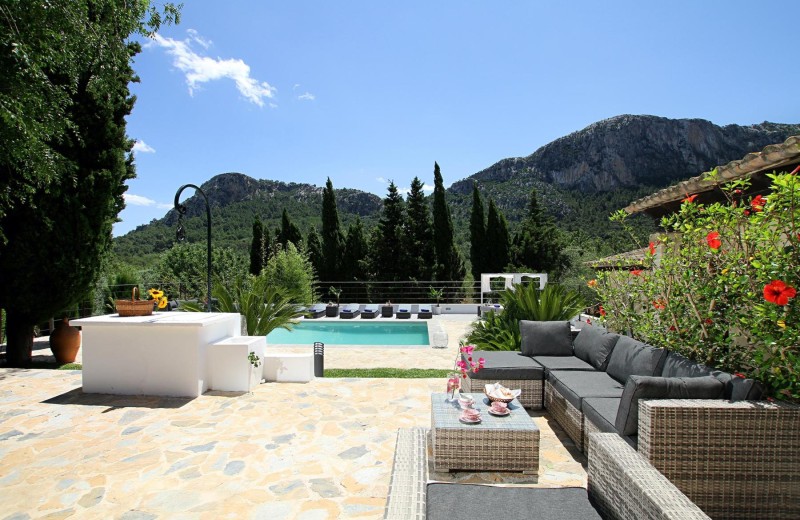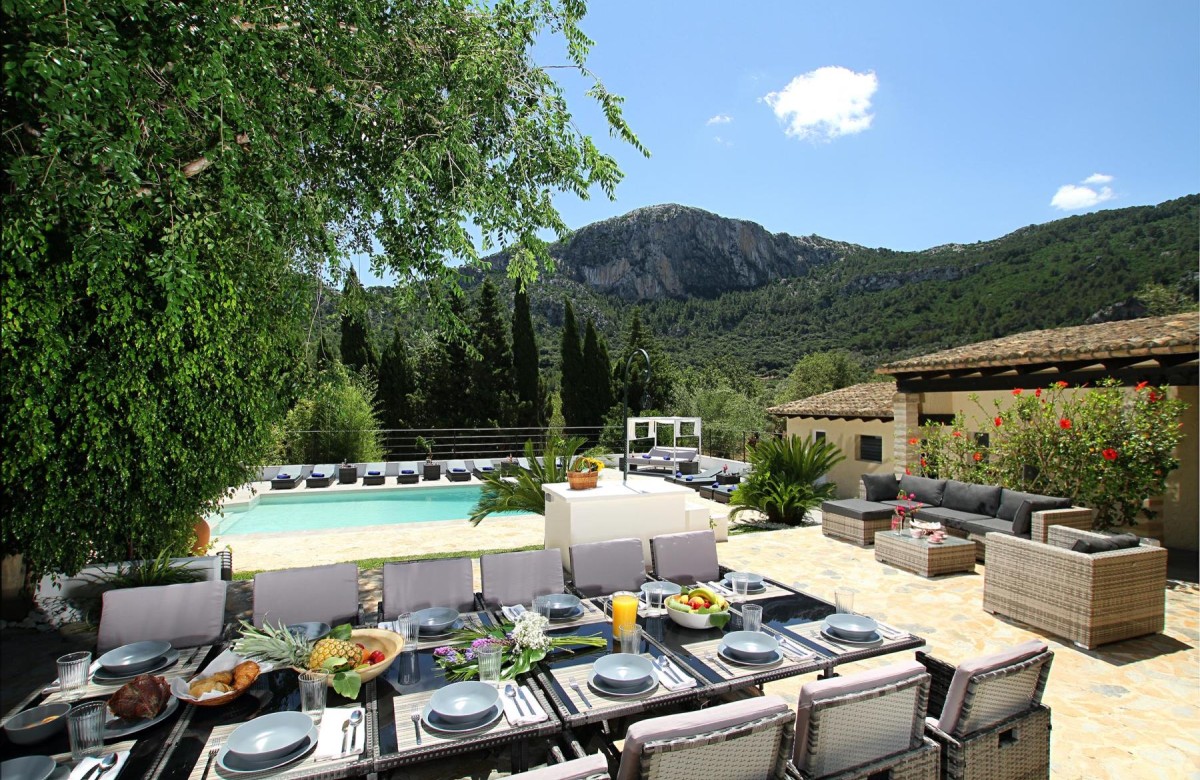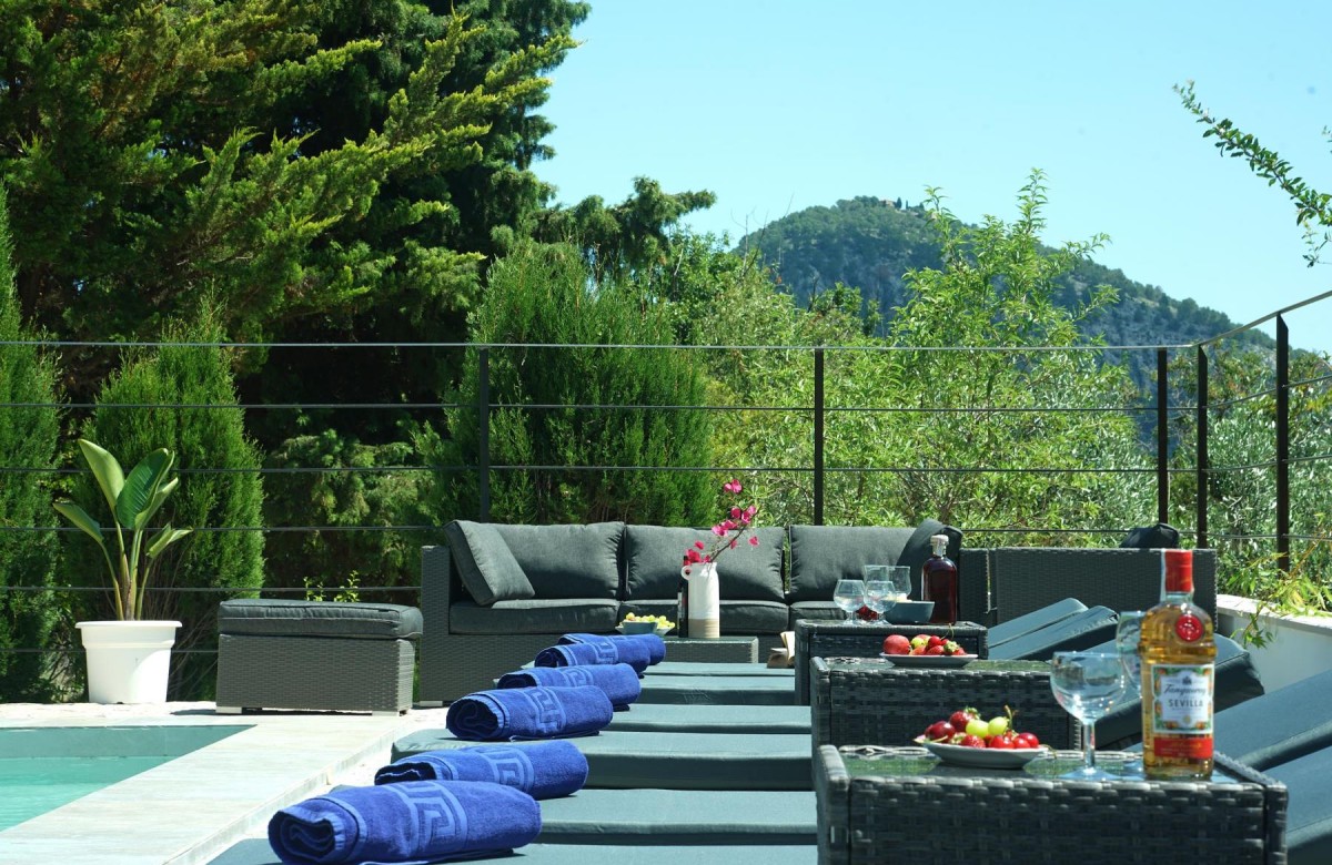 Im Außenbereich finden sich geräumige Terrassen mit verschiedenen Aufenthaltsbereichen, um in den heißen Sommermonaten im Freien zu speisen oder auch einen Aperitif oder ein paar Drinks in einem der beiden Chill-out-Bereiche zu genießen und dabei den schönen Blick auf das Tal und die umliegenden Berge zu bewundern. Auf einer Seite der Terrasse befindet sich zudem eine überdachte Grillstelle mit einem Kühlschrank. Der Terrassenbereich am Pool bietet rechlich Platz für Entspannung auf den Sonnenliegen oder dem balinesischen Daybed. Der Pool, der über römische Treppen verfügt, wurde ebenfalls komplett renoviert und neu gefliest.