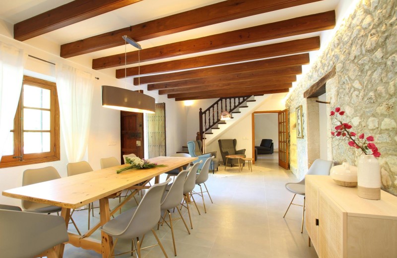 Betritt man das Zentrum des Hauses, gelangt man in einen geräumigen Wohn- und Essbereich mit traditionellen Wänden und Beleuchtung. Von hier aus hat man Zugang zur voll ausgestatteten Küche, in der noch der für alte mallorquinische Häuser typische Kamin (heute außer Betrieb) erhalten ist. Im Erdgeschoss befindet sich außerdem ein großer Aufenthaltsraum, in dem man Tischkicker spielen oder auf dem großen, gemütlichen Sofa mit Chaise Longue entspannen kann, um Filme auf dem beeindruckenden 65-Zoll-Bildschirm zu genießen. Der Smart-TV ist mit einer drahtlosen Internetverbindung ausgestattet, sodass die Gäste ihre Konten bei Amazon, Netflix und anderen Plattformen nutzen können.
