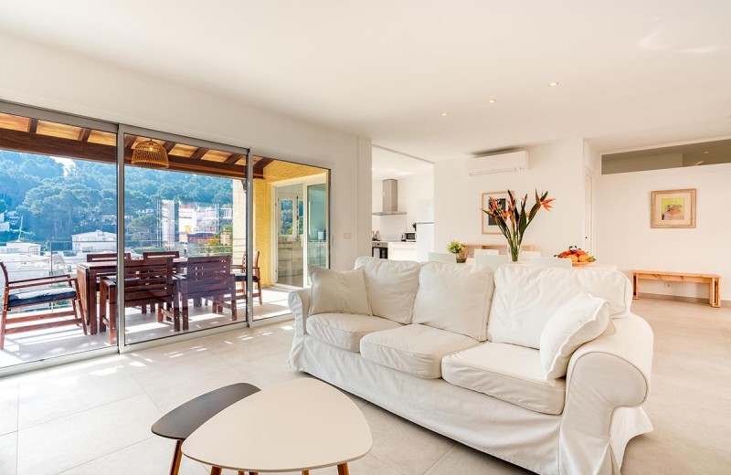 Betreten Sie eine helle und geräumige Wohlfühloase: Der großzügige Wohn-Essbereich mit seiner modernen, offenen Einbauküche bietet sofort ein heimeliges Gefühl. Von hier gelangen Sie durch große Glasschiebetüren direkt auf Ihre private Balkonterrasse, die Sie mit einem fantastischen und unverbauten Blick auf die schöne Bergkette Cavall Bernat belohnt – ein idealer Ort für entspannte Abende.