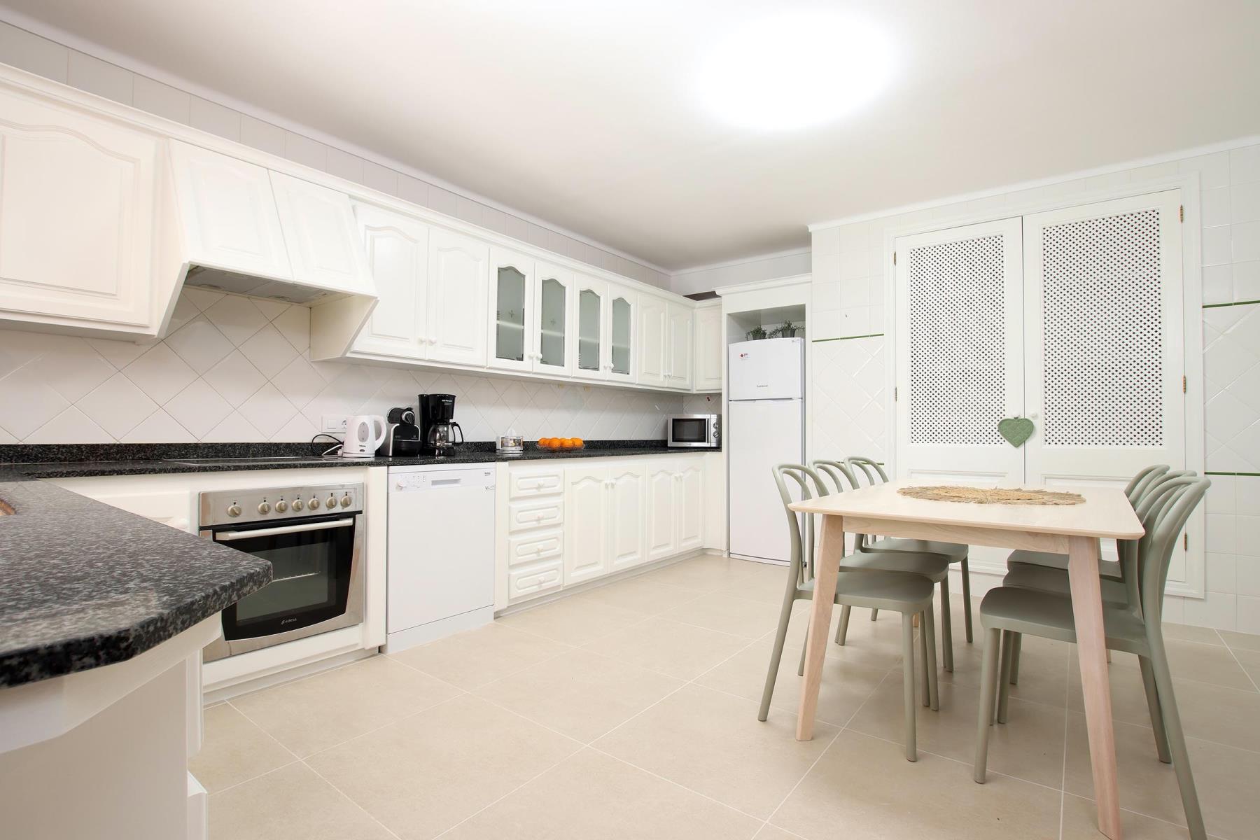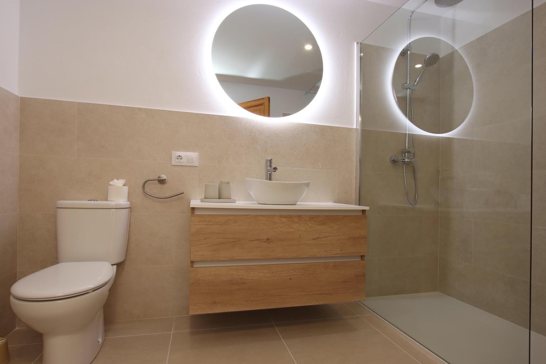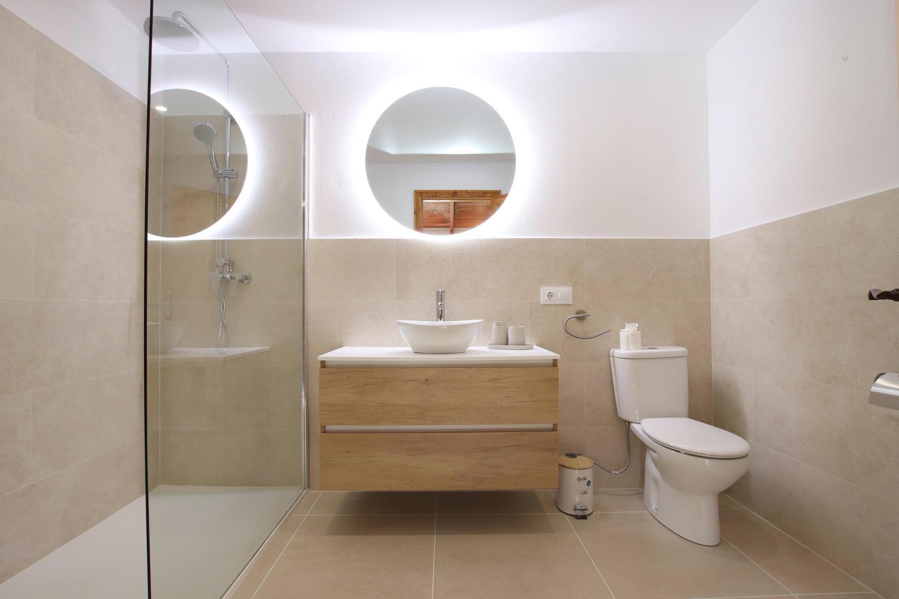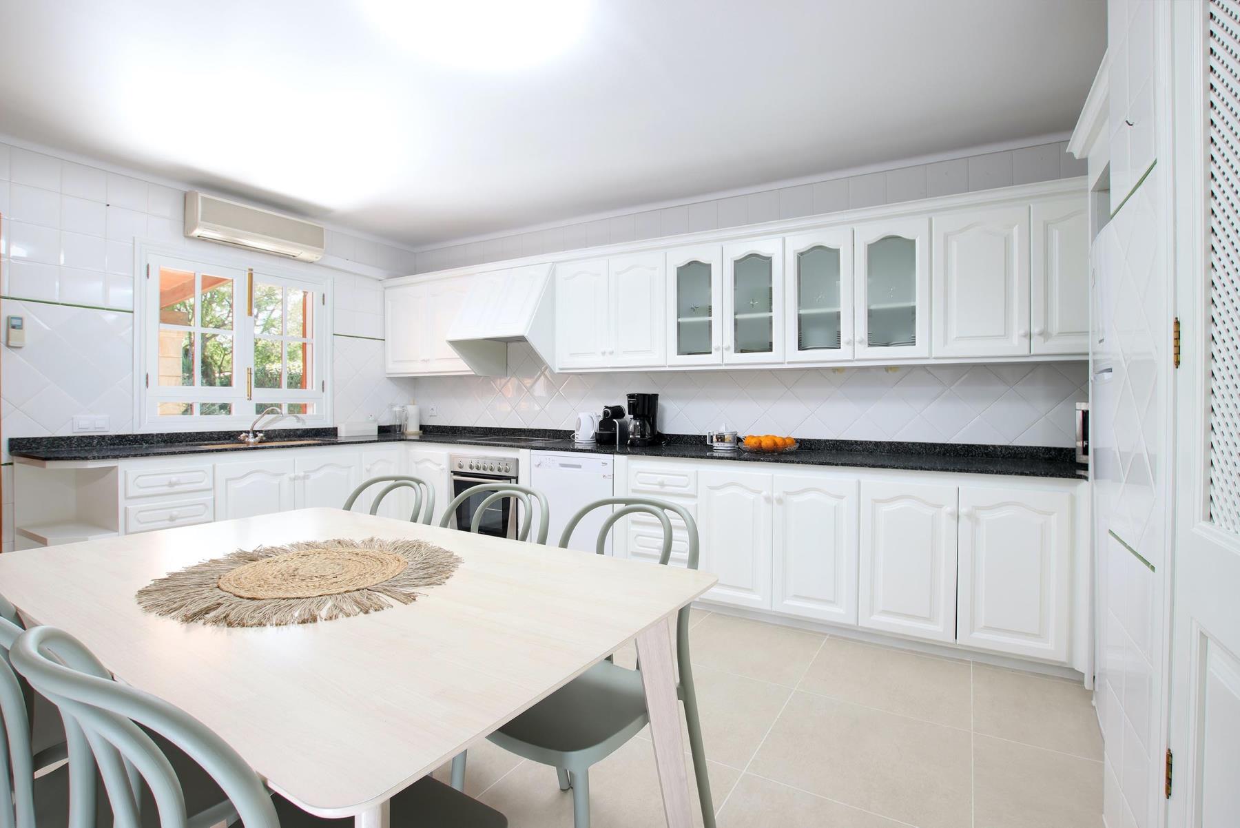 Betreten Sie das modern-mediterran eingerichtete Innere der Finca und finden Sie im offenen Wohn- und Essbereich eine einladende Atmosphäre vor. Ein separater TV-Bereich mit bequemer Sofaecke wird zum gemütlichen Rückzugsort für gesellige Filmabende. Die vollausgestattete Küche mit gemütlicher Frühstücksecke bietet Platz für gemeinsame Mahlzeiten.