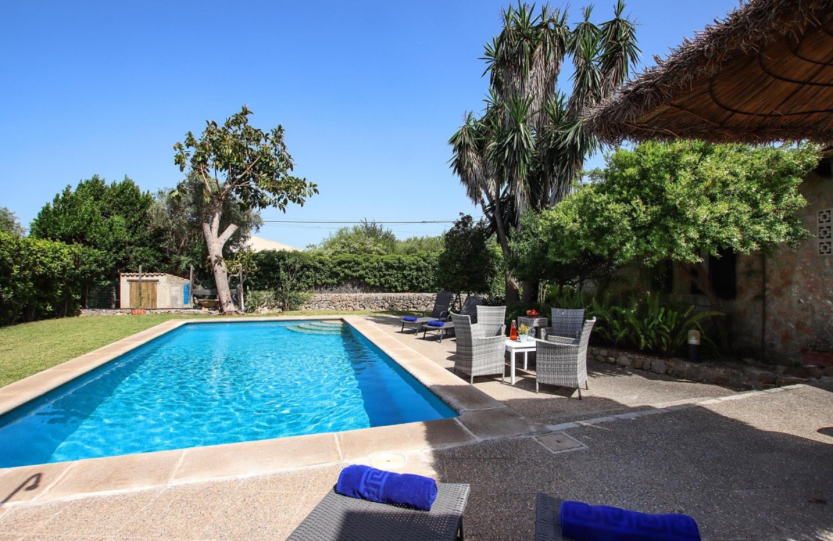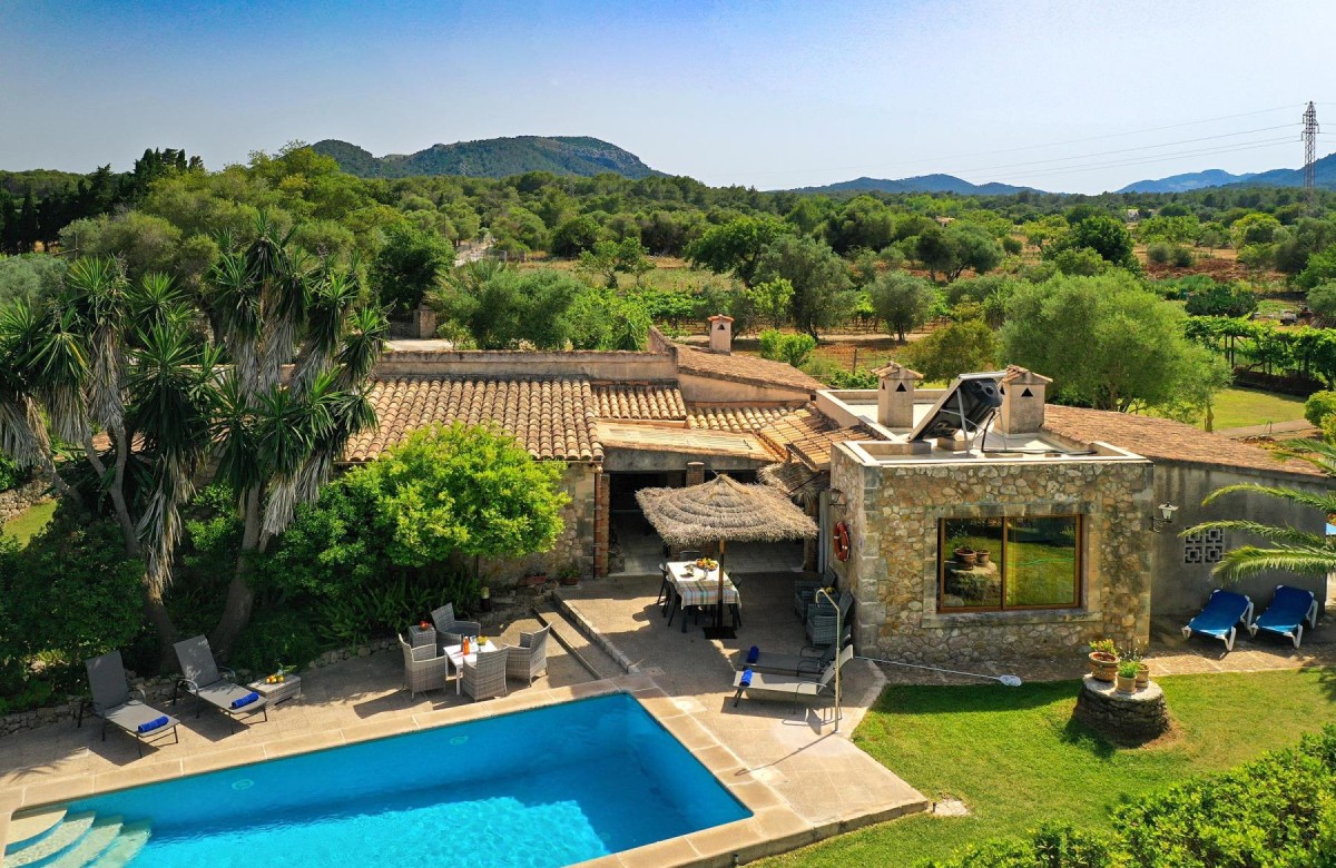 Diese prächtige spanische Finca wurde im traditionellen Naturstein-Stil erbaut und beeindruckt mit einer traumhaften Lage auf dem Land. Das Ferienhaus bietet eine idyllische Rückzugsmöglichkeit, ist jedoch nur wenige Autominuten von den charmanten Geschäften und Restaurants der Altstadt von Pollensa sowie den beliebten Badeorten Alcudia und Puerto Pollensa entfernt. Zu den Highlights gehören ein privater Swimmingpool (8 x 4 Meter und 1,20 bis 2,10 m Tiefe), umgeben von exotischen Palmen, ein großzügiges Grillhaus und ein geschmackvoll gestaltetes Interieur im klassischen Design. WLAN und Klimaanlage/Heizung in allen drei Schlafzimmern sind selbstverständlich inklusive.