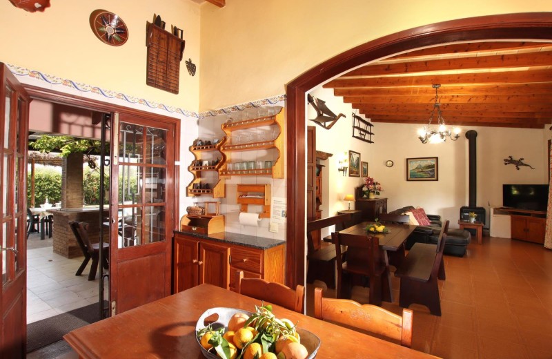 Das Innere der Villa kombiniert den Charme eines traditionellen mallorquinischen Landhauses mit modernen Annehmlichkeiten. Das Wohnzimmer ist mit einem dekorativen Holzofen, stilvoller Einrichtung und bequemen Sitzmöbeln ausgestattet. Ein Esstisch mit Stühlen ergänzt den Raum, der durch einen Rundbogen mit der Küche verbunden ist. Die Küche verfügt über einen einladenden Frühstückstisch, Blick auf die umliegenden Obstplantagen und eine Terrassentür, die direkt zur hinteren Terrasse führt.