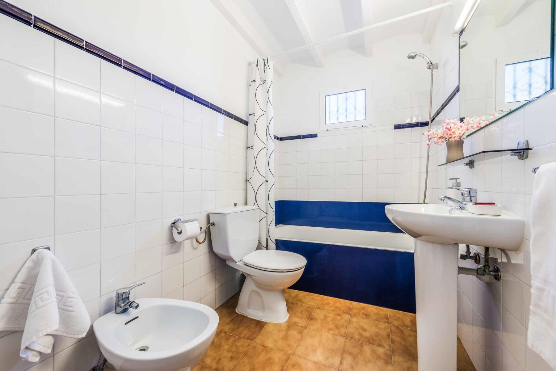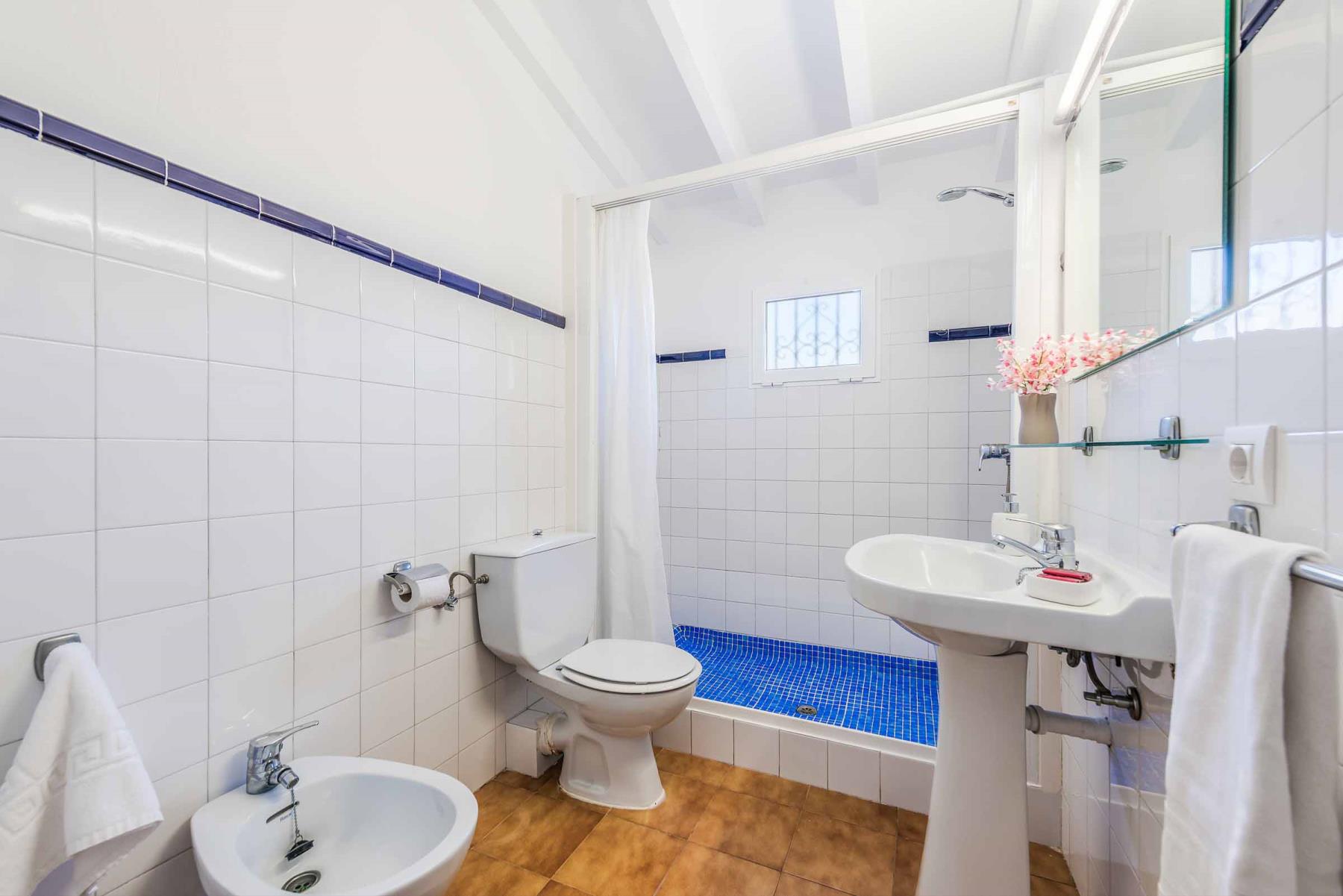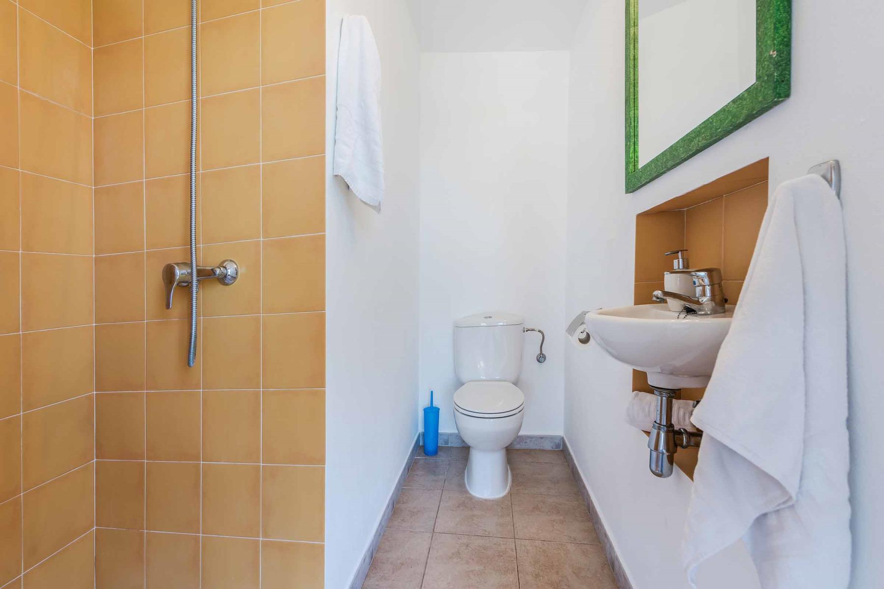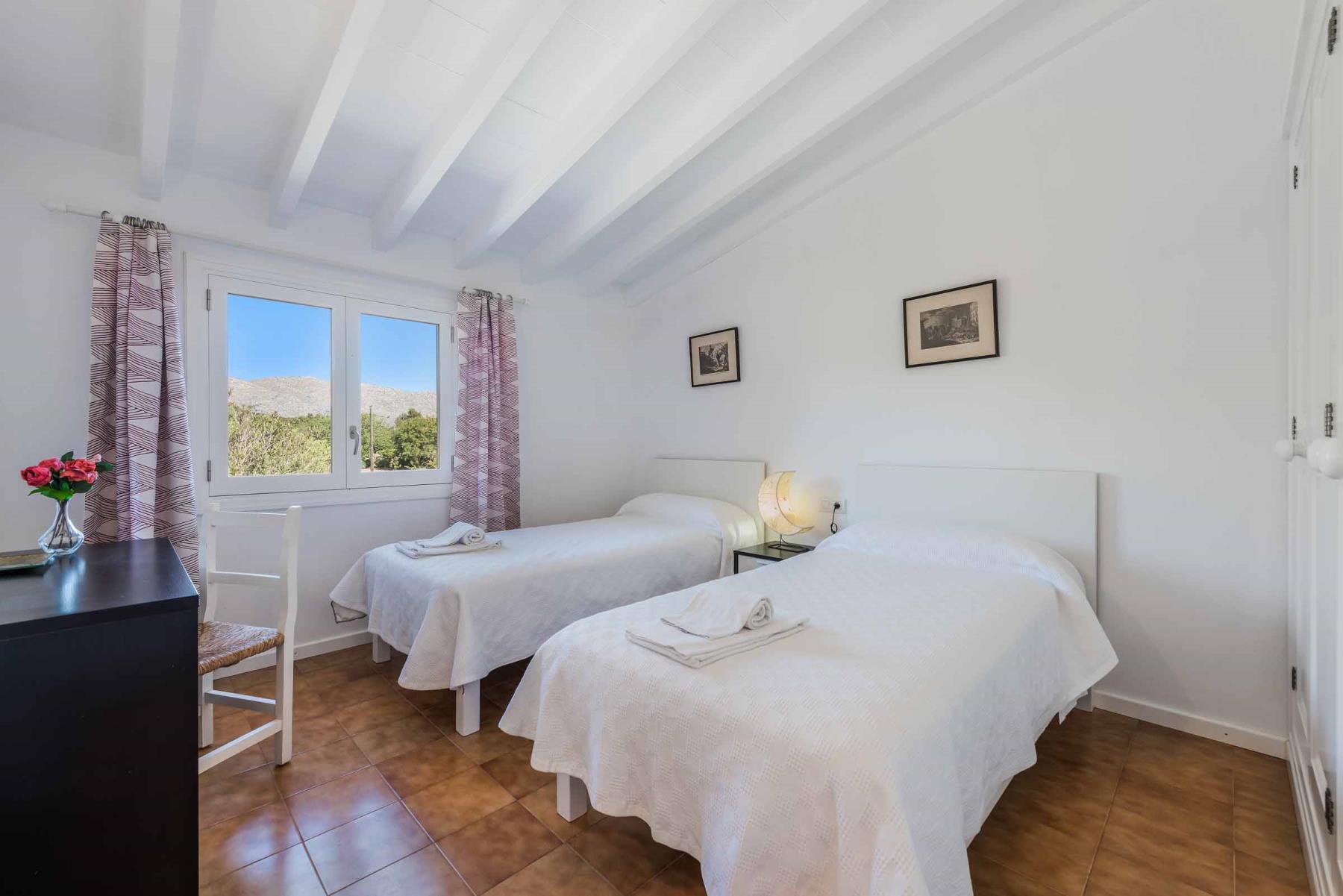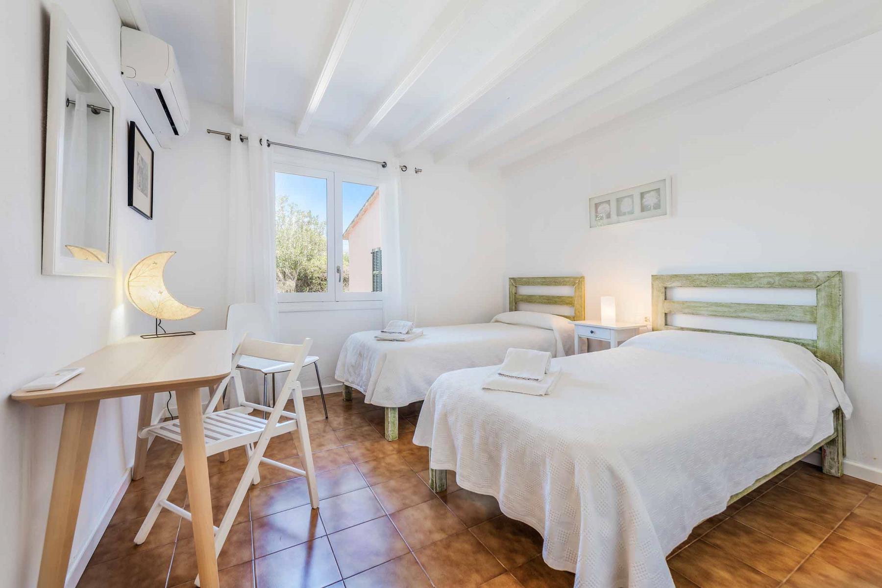 Für eine erholsame Nachtruhe stehen vier Schlafzimmer zur Verfügung: ein Doppelzimmer und drei Zweibettzimmer. Diese teilen sich zwei Badezimmer, eines davon mit Dusche, das andere mit Badewanne. Als besonderes Plus gibt es ein zusätzliches Außenduschbad – perfekt, um sich nach einem erfrischenden Bad im Pool nicht erst ins Haus begeben zu müssen. Alle Schlafzimmer sind mit Klimaanlagen ausgestattet. Aus Respekt vor der Umwelt und zur Energieeinsparung ist die Klimaanlage zeitzgesteuert, sodass sie Ihnen während der Mittagshitze und throughout der Nacht für ein angenehmes Raumklima sorgt.