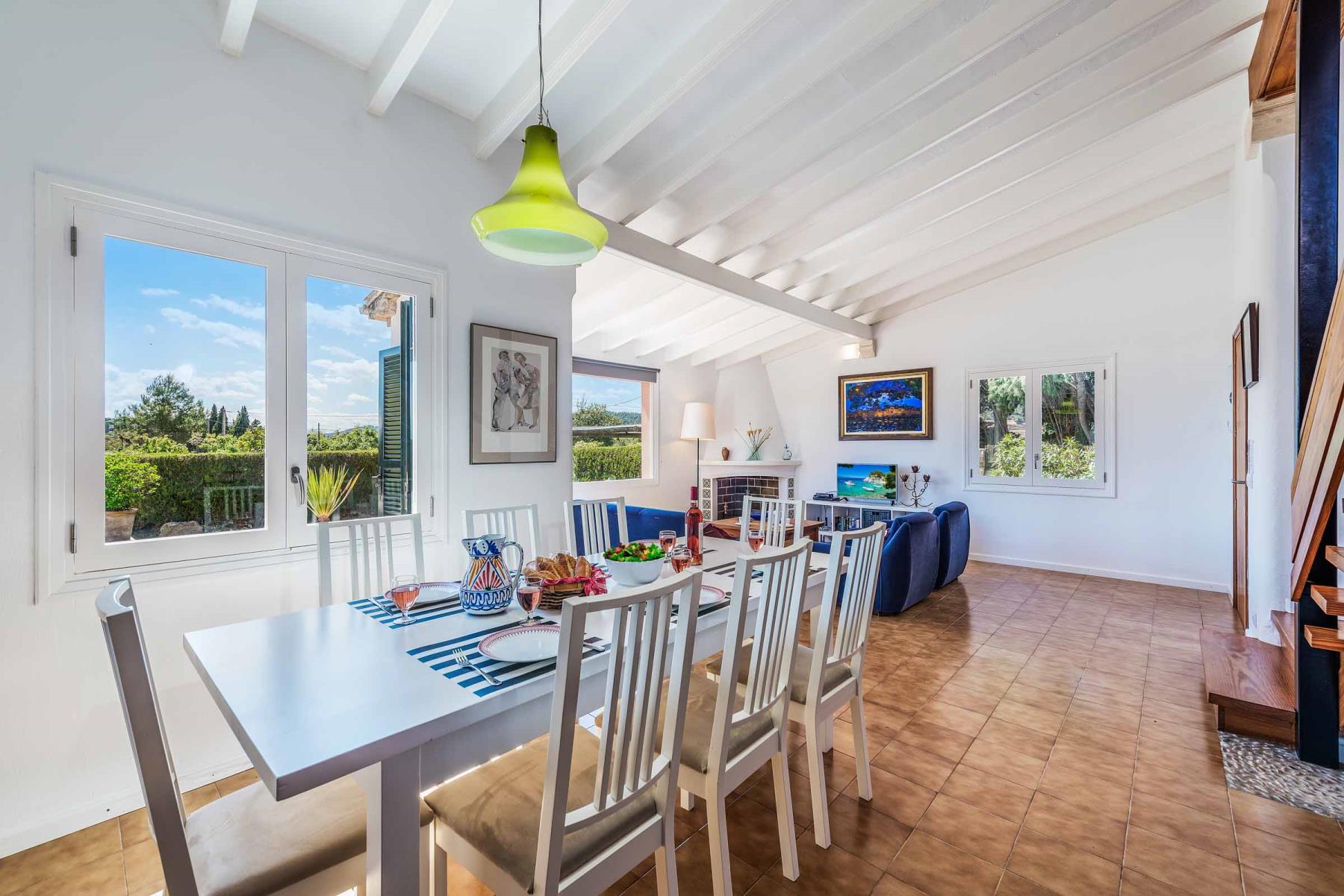Eingebettet in die ländliche Idylle erstreckt sich diese traditionelle Finca über zwei Ebenen und bezaubert mit einem lieblichen Blick auf den Hügel Puig de Maria. Umgeben von üppigen Gärten, ist die Villa im typisch mallorquinischen Stil gestaltet: mit keramischen Fliesen, strahlend weißen Wänden und landestypischen Möbeln, die urwüchsigen Charme mit Komfort verbinden.