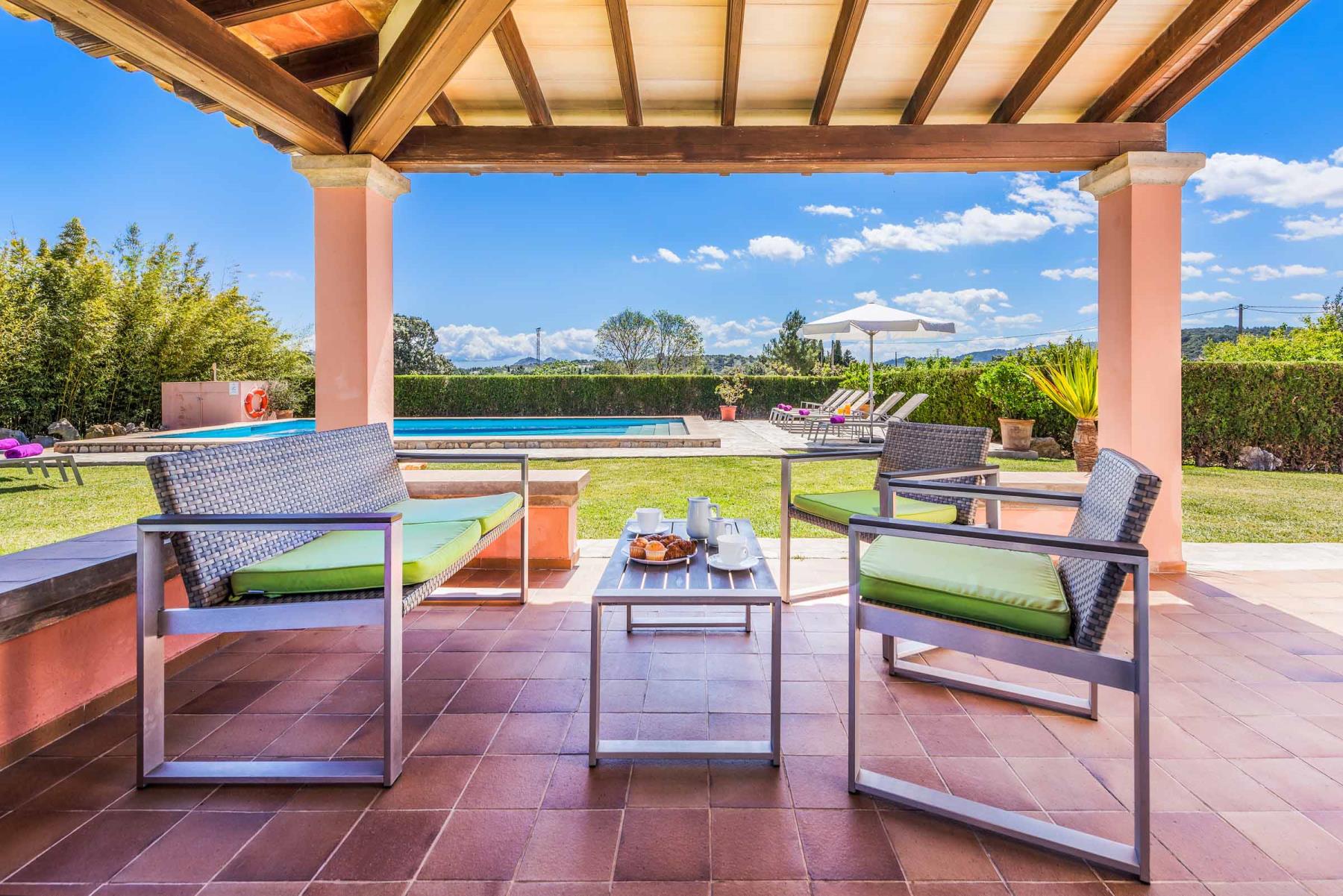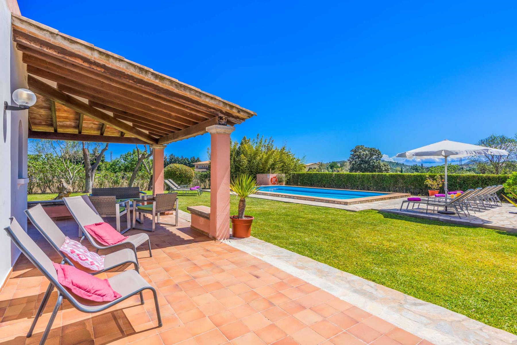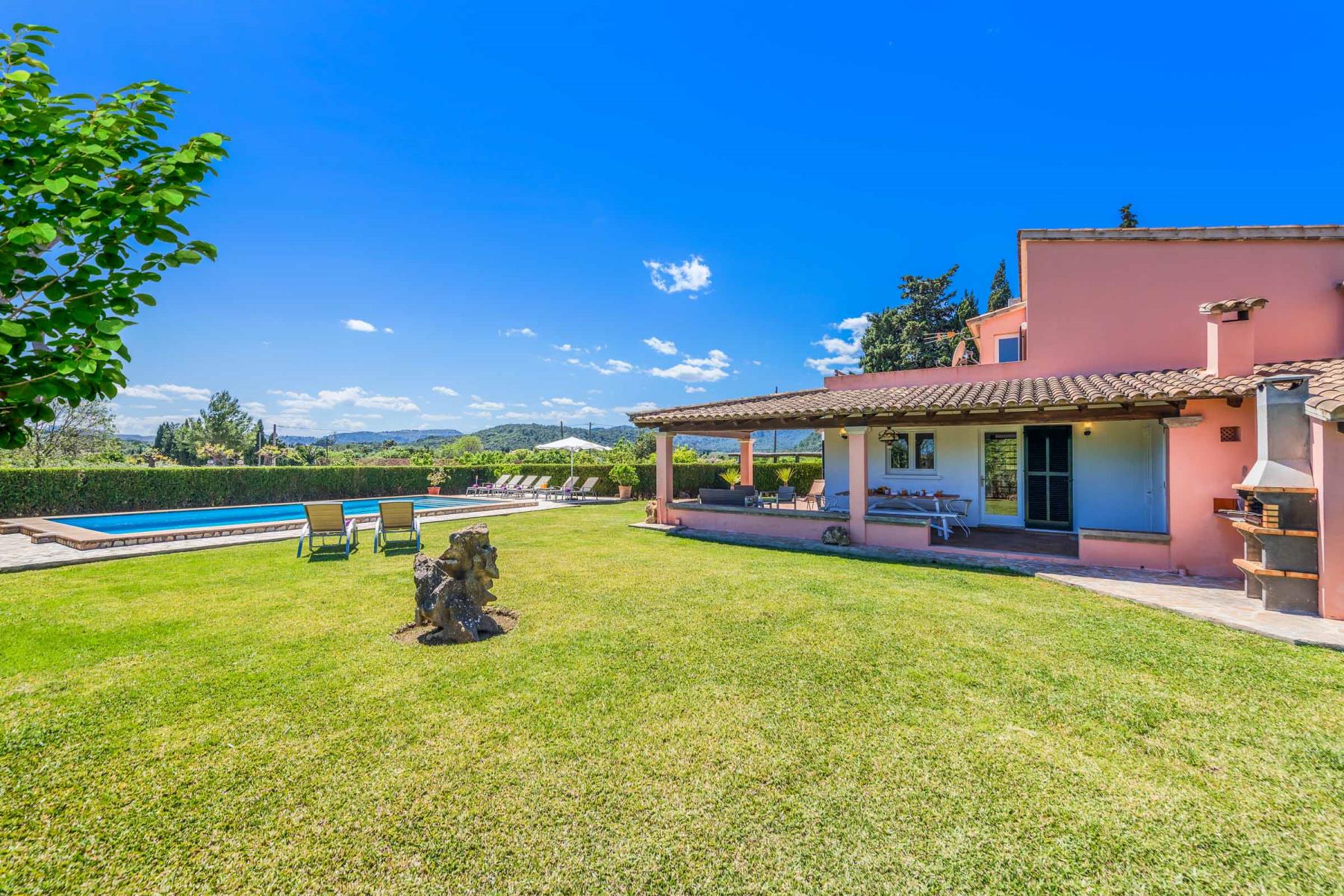 Das wahre Herzstück dieser Villa sind jedoch die Terrassen, der Garten und der Pool. Eine kleine Dachterrasse bietet Ihnen atemberaubende Ausblicke über die umliegende Landschaft und den Puig de Maria. Der großzügige Rasenbereich bietet reichlich Platz für Kinder zum Spielen und Toben, was die Finca besonders für Familien attraktiv macht. Genießen Sie hier laue Sommerabende bei einem gemeinsamen Mahl unter freiem Himmel – der perfekte Ort, um unvergessliche Urlaubsmomente zu erleben.
