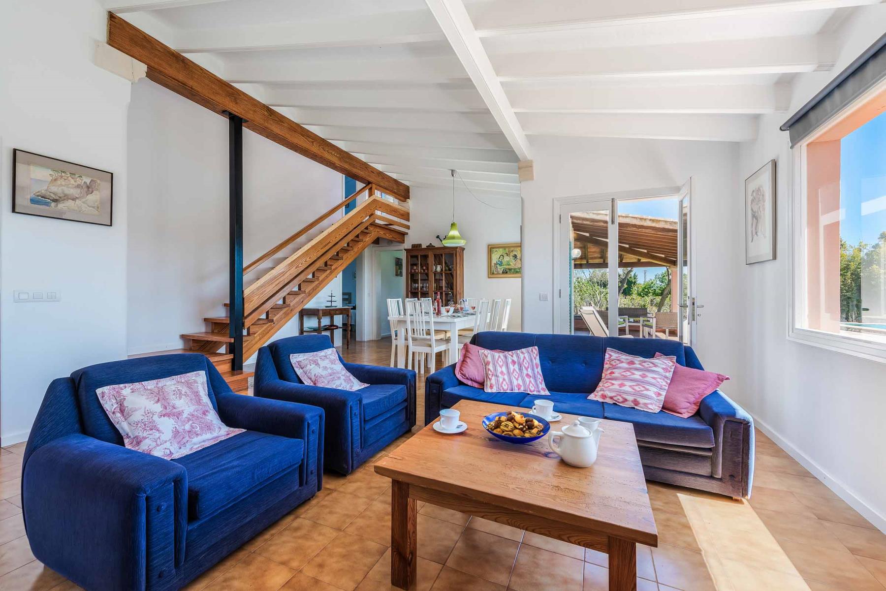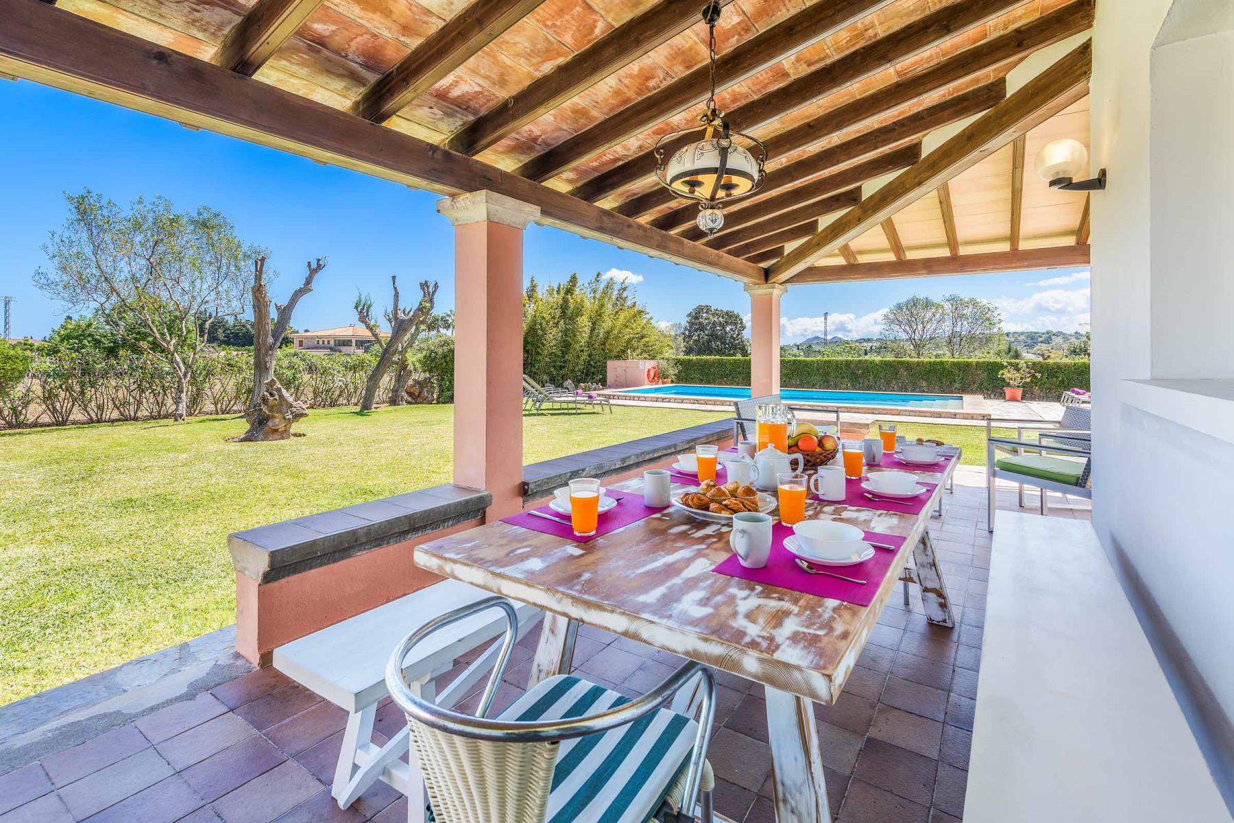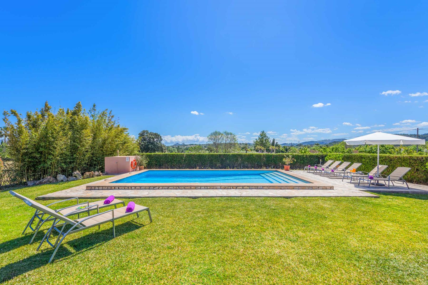 Das wahre Herzstück dieser Villa sind jedoch die Terrassen, der Garten und der Pool. Eine kleine Dachterrasse bietet Ihnen atemberaubende Ausblicke über die umliegende Landschaft und den Puig de Maria. Der großzügige Rasenbereich bietet reichlich Platz für Kinder zum Spielen und Toben, was die Finca besonders für Familien attraktiv macht. Genießen Sie hier laue Sommerabende bei einem gemeinsamen Mahl unter freiem Himmel – der perfekte Ort, um unvergessliche Urlaubsmomente zu erleben.