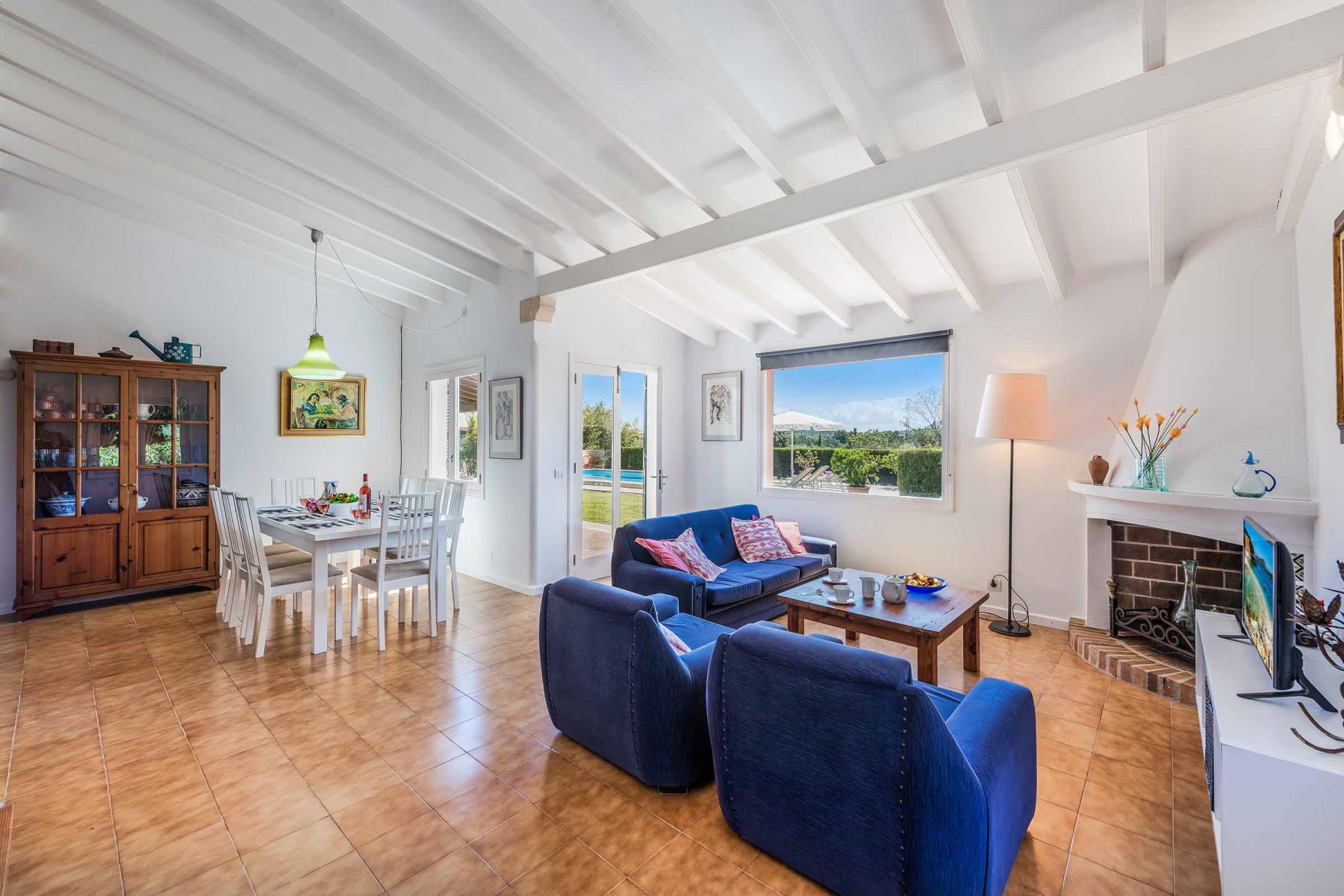 Betreten Sie das Haus durch den Haupteingang und finden Sie sich in einem gemütlichen Wohn- und Essbereich wieder. Hier laden bequeme Sofas zum Entspannen ein – ob zum Fernsehen via Satellit, für einen DVD-Abend oder um in der kühleren Jahreszeit die gemütliche Atmosphäre am offenen Kamin mit Holzofen zu genießen. Angeschlossen ist eine geschmackvoll eingerichtete Landhausküche, die mit reichlich Stauraum, einem Gasherd, Elektrobackofen, Geschirrspüler, Mikrowelle und einem Kühl-/Gefrierschrank keine Wünsche offenlässt. Französische Türen vom Wohnbereich öffnen sich auf eine wunderbar beschattete Terrasse, die den Blick auf den Swimmingpool und den Garten mit seinen Palmen und einer Fülle weiterer mediterraner Pflanzen freigibt.